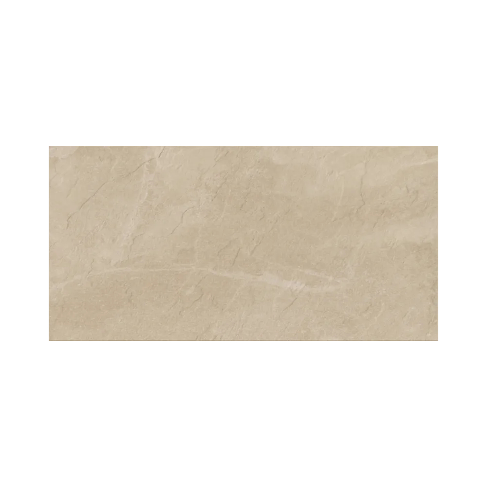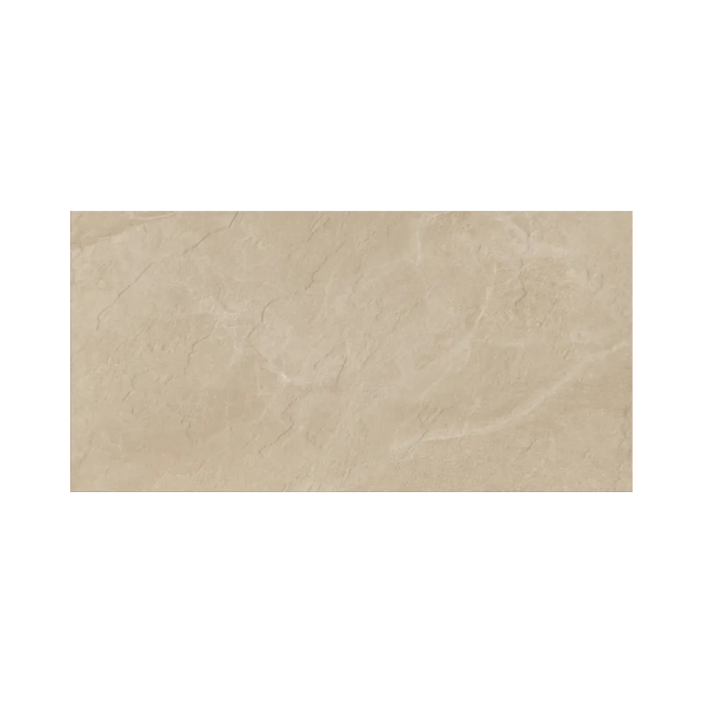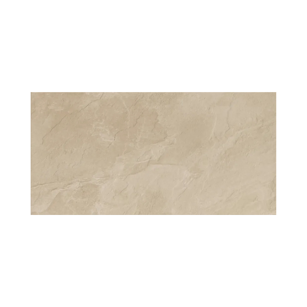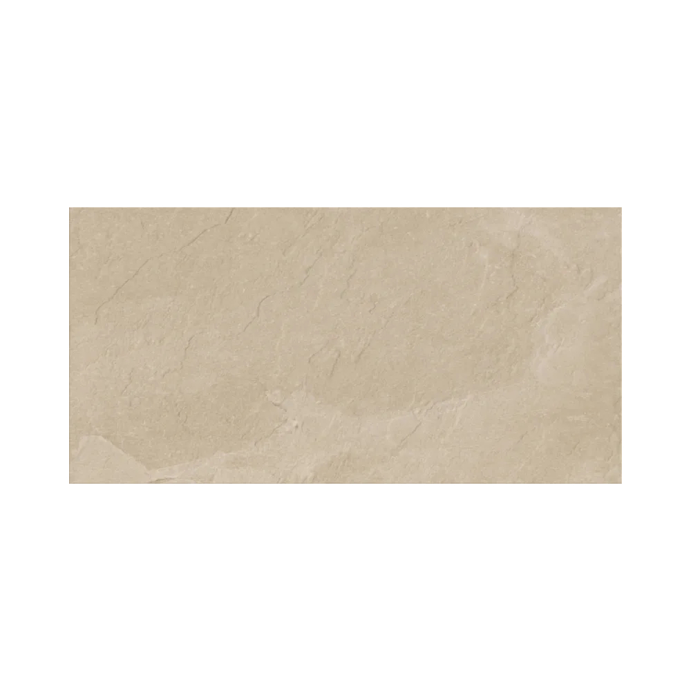 Die kraftvolle und naturnahe beige Farbgebung prägt das Erscheinungsbild dieser Fliese in Schieferoptik im Format 30x60x0,8.