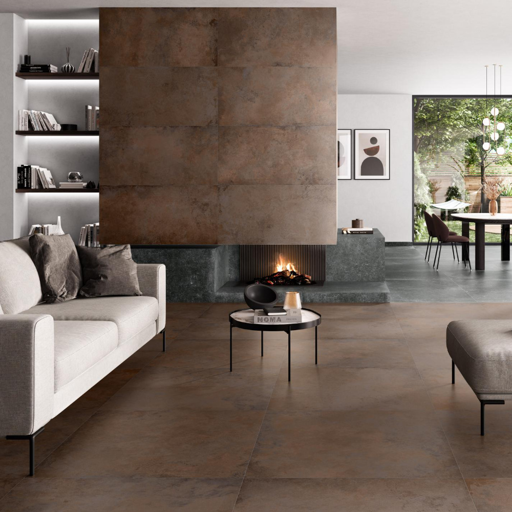 Im Format 60×120 wirkt Alloy M Copper besonders kraftvoll und exklusiv. Die reduzierte Fugenanzahl verstärkt den Eindruck großflächiger Metallplatten und eignet sich hervorragend für Akzentwände oder Designböden.