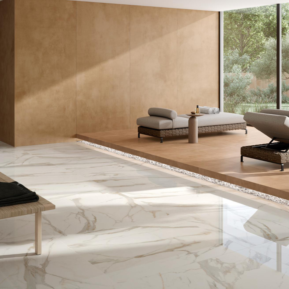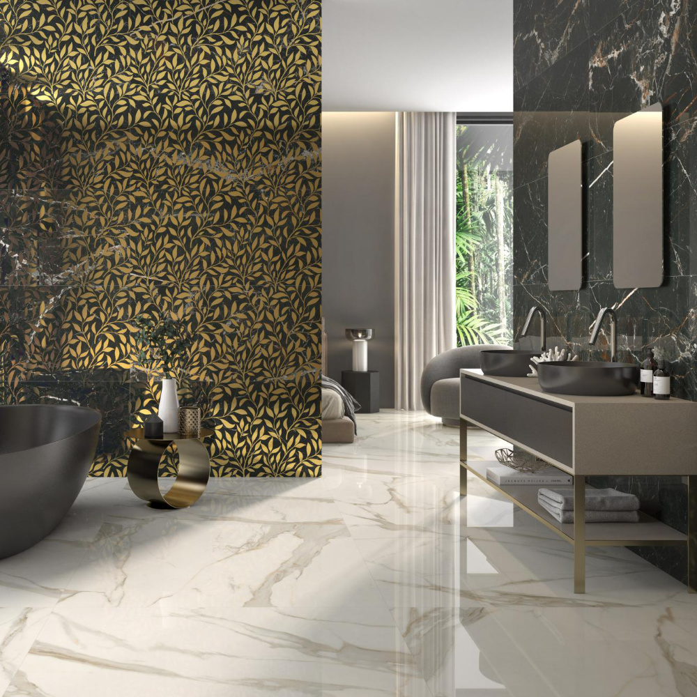 Die polierte Variante im Format 60×60 cm überzeugt mit edler Hochglanzoptik und klassischem Marmorcharakter. Lichtreflexionen verstärken die Tiefe der goldenen Adern und verleihen dem Raum eine luxuriöse Note.