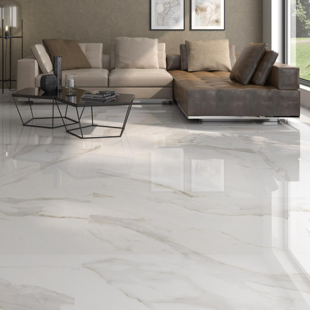 Die polierte 60×60 cm Fliese der Serie CR.Apulia setzt elegante Akzente und verleiht Räumen eine luxuriöse Ausstrahlung. Die glänzende Oberfläche hebt die feinen goldenen Aderungen der Marmoroptik hervor und sorgt für ein edles Lichtspiel.